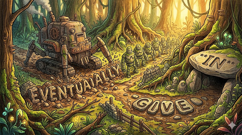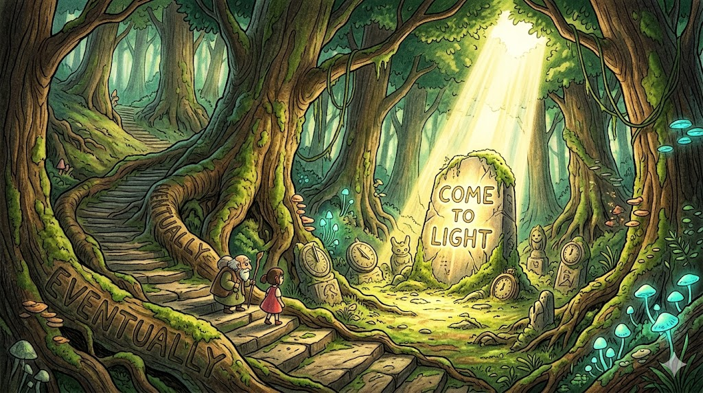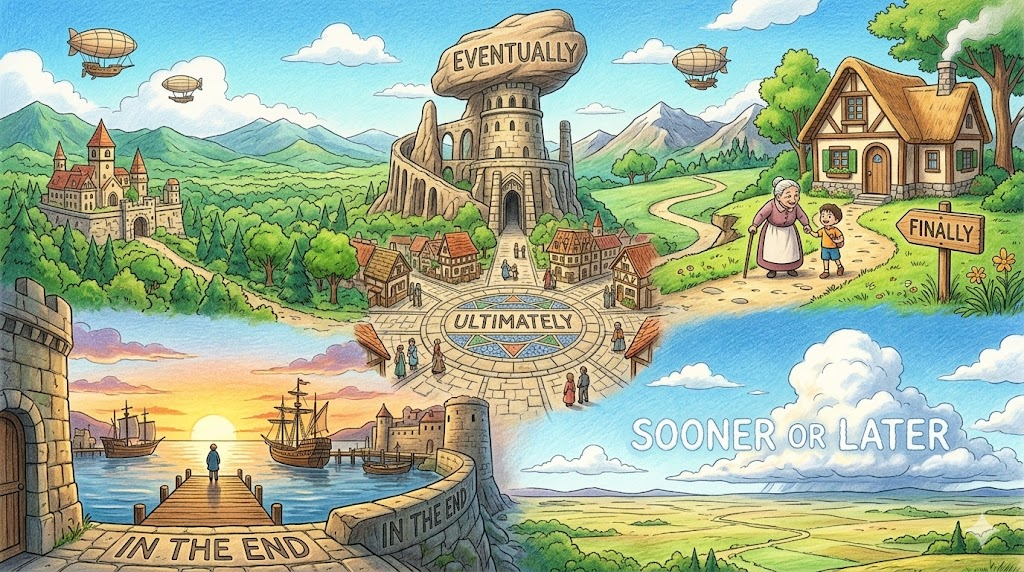 단순한 '결국(in the end)'을 훨씬 넘어, "모든 과정과 사건들을 통과한 끝에 밖으로 나오는" 필연적 도달의 이미지를 담고 있습니다. eventually가 쓰이는 순간, 그것은 단순한 결말의 선언이 아니라 "시간이 걸리더라도 모든 과정을 거쳐 반드시 도달하게 되는" 필연의 선언입니다.