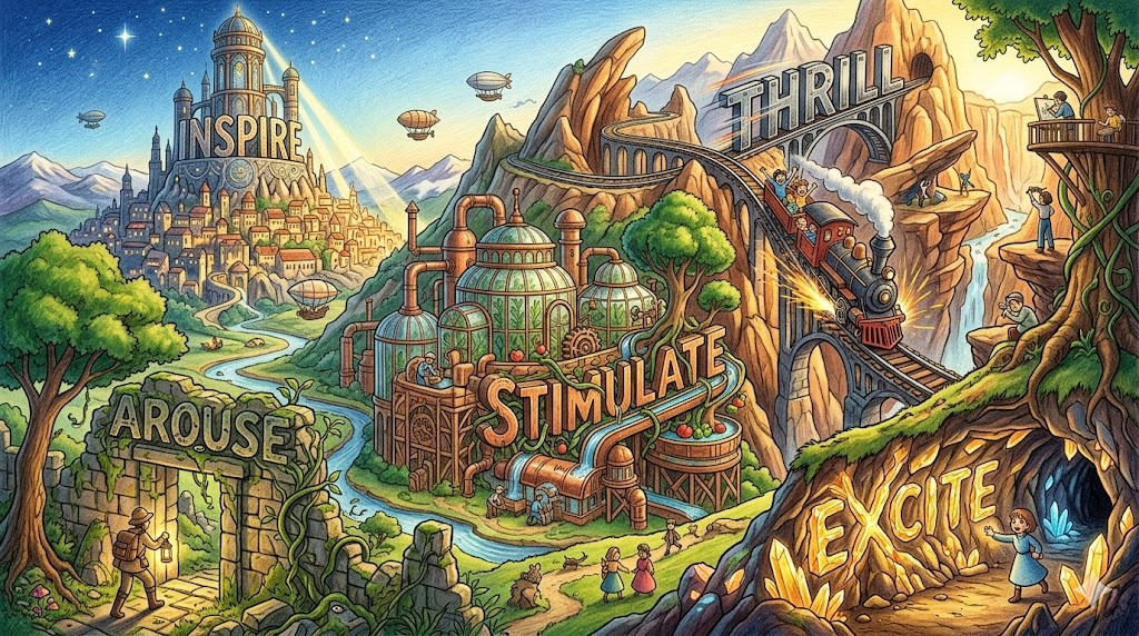 - excite: 잠들어 있던 것을 깨워 활발하게 불러일으키는 — 감정적 강도가 강함