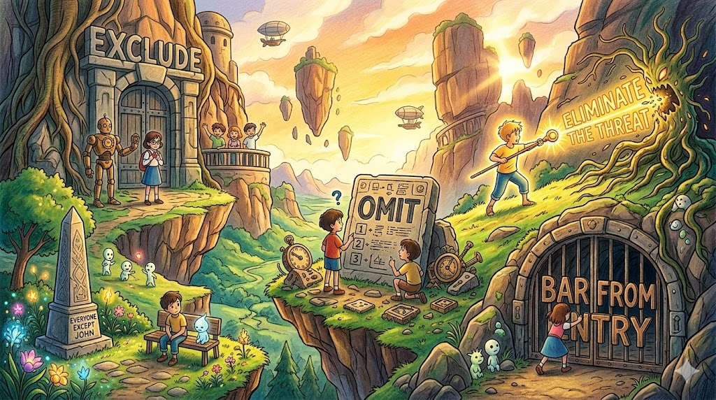 exclude는 단순한 "제외하다"가 아니라, 문을 완전히 닫아 특정한 것이 안으로 들어오지 못하도록 완전히 차단하듯 의도적이고 완전한 차단·봉쇄로 범위·집단·가능성에서 완전히 배제하는 봉쇄의 언어다 — exclude가 있는 곳엔 언제나 '단순한 제외가 아닌, 문을 완전히 닫아 절대 들어올 수 없게 하는 의도적 봉쇄'가 있다.