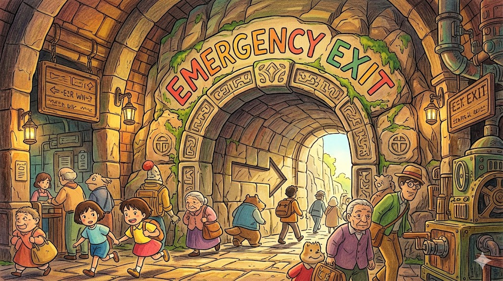 화재나 재난 시 긴급하게 대피할 수 있는 비상 출구를 뜻합니다. 안전·건축·항공 맥락에서 핵심적으로 씁니다.