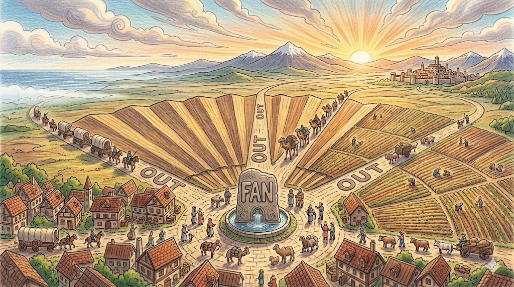(일상/군사/수능) 사람들이나 물건들이 부채처럼 여러 방향으로 퍼져나가는 것을 뜻합니다. 수능 독해 사회·역사·과학 지문의 핵심 표현입니다.