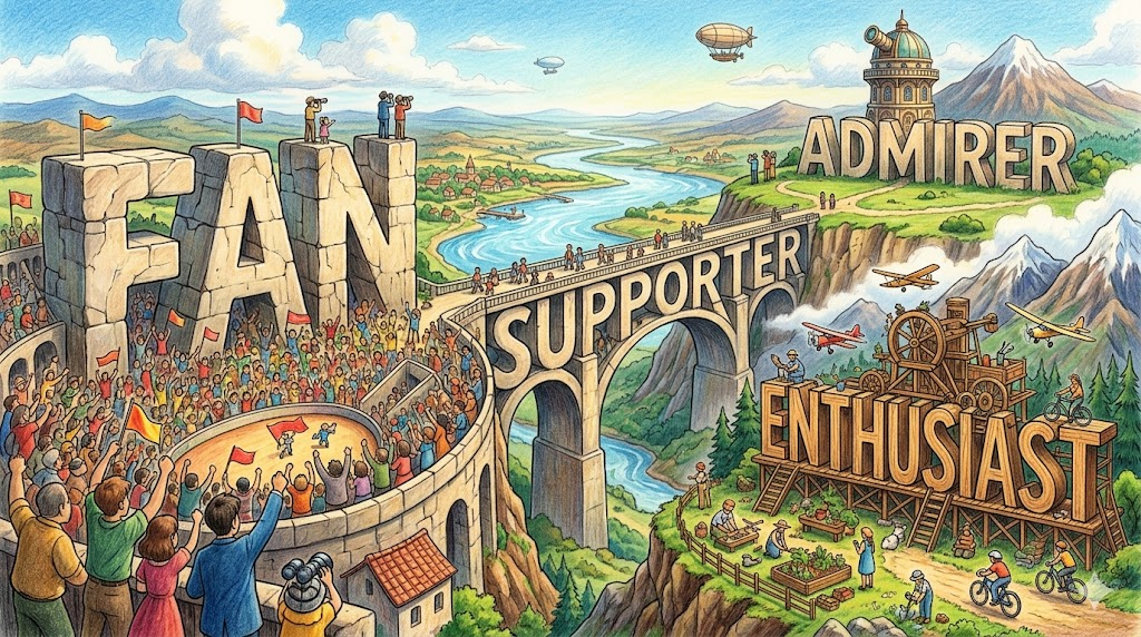 'fan'은 라틴어 vannus(곡식을 까부르는 체, 부채) 에서 유래했으며, 나중에 "fanatic(열광적인 사람)" 의 줄임말로 쓰이게 되었습니다. 어원의 핵심 이미지는 "바람을 일으켜 무언가를 퍼뜨리는 것" 으로, 단순히 바람을 만드는 것이 아닌 "에너지나 열정을 퍼뜨리고 키워나가는" 것이 이 단어의 본질입니다.