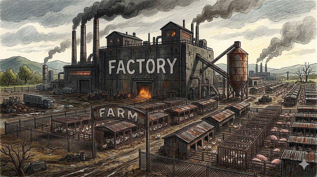 - factory farm: 이익 극대화를 위한 대규모 공장식 밀집 사육 — 동물 복지·환경 문제와 연결