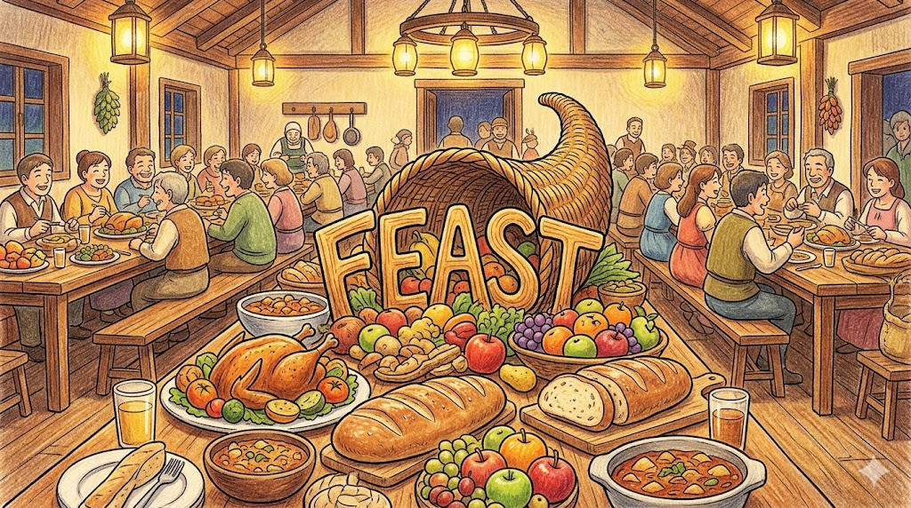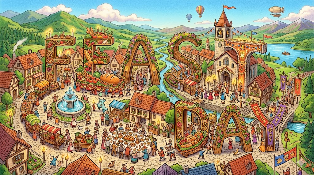 'feast'는 라틴어 festa(축제, 즐거운 날) 에서 유래했으며, festus(즐거운, 축제의) 가 핵심 어근입니다. 어원의 핵심 이미지는 "특별한 날에 함께 모여 풍성하게 즐기는" 것으로, 단순한 식사가 아닌 "일상을 넘어서는 풍요로운 기쁨이 넘치는 특별한 경험" 이 이 단어의 본질입니다.