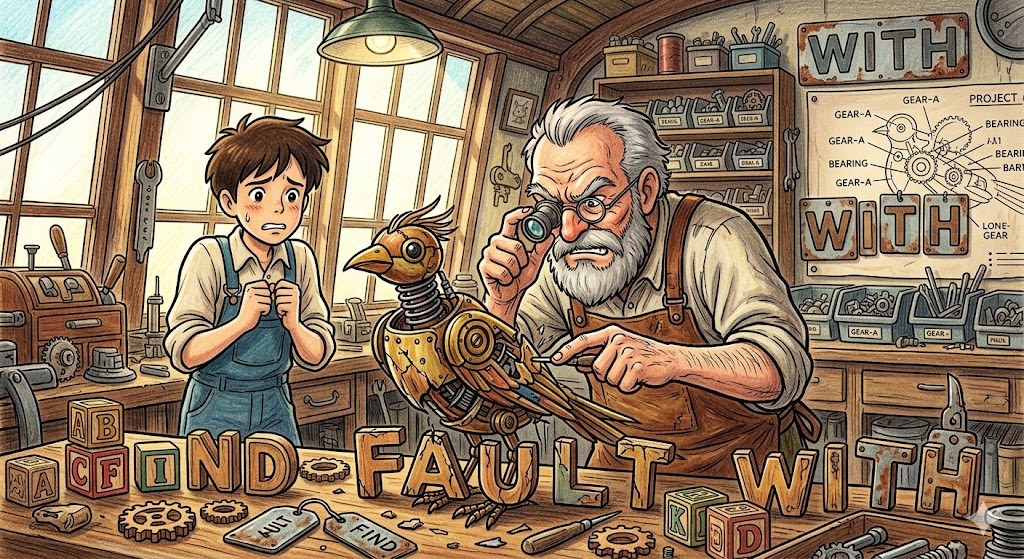 - find fault with → ~의 흠을 찾다, 트집을 잡다 ("He always finds fault with everything." 그는 항상 뭐든 트집을 잡아)