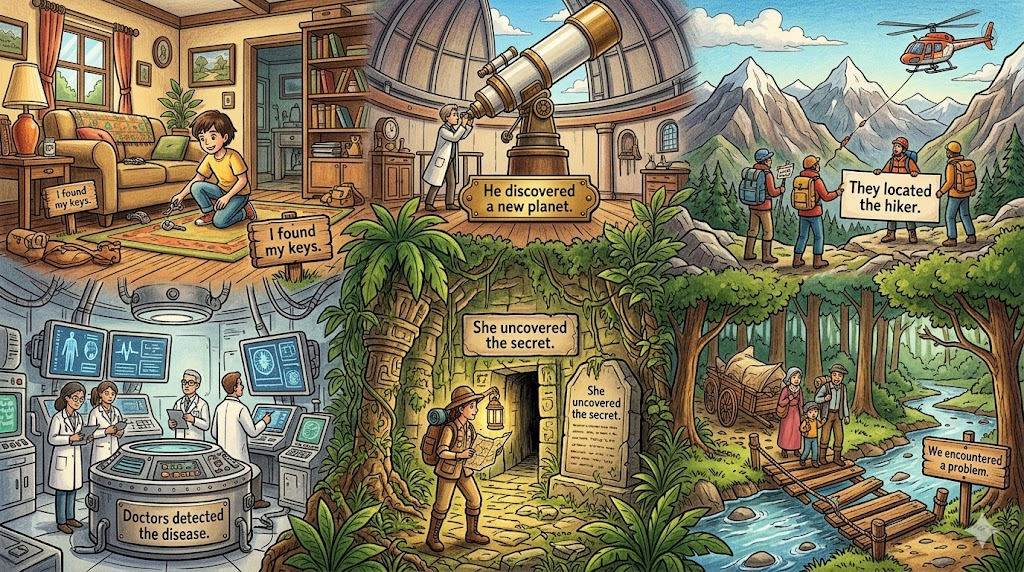 ① 동사 — 찾다, 발견하다 (물리적): I found my keys under the sofa. (소파 아래에서 열쇠를 찾았다.)
