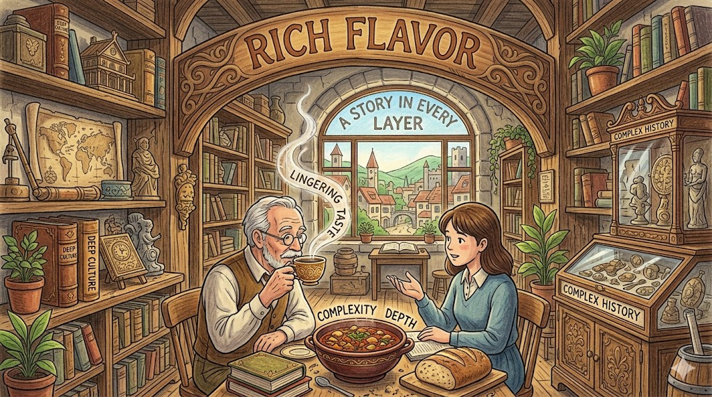 단순하지 않고 깊이·복잡성·여운이 있는 풍부한 맛을 뜻합니다. 음식 외에도 예술·문화·역사·인물이 가진 깊이 있고 복잡한 특색을 묘사할 때 씁니다.