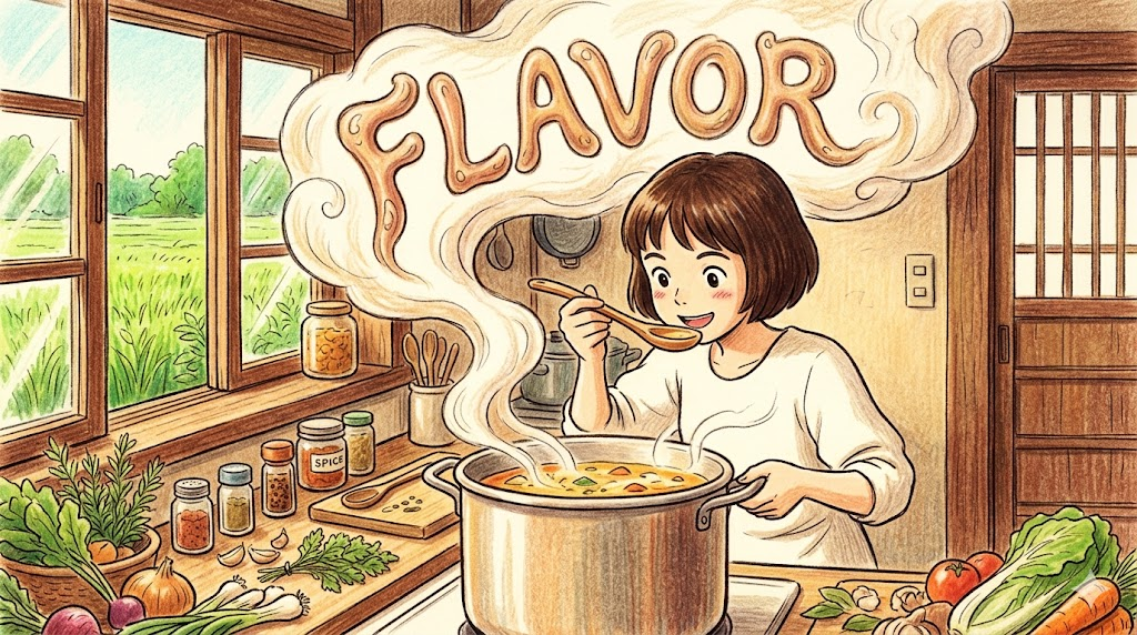 "코와 입을 통해 감지되는 복합적 감각 인상" 이미지처럼, flavor가 쓰이는 순간 그것은 단순한 혀의 미각 선언이 아니라 "향기·식감·온도·경험이 어우러져 만들어지는 복합적 감각 전체"의 선언입니다.