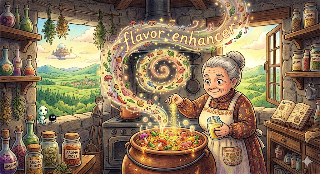 음식 자체의 맛을 더 강하고 풍부하게 느끼도록 돕는 첨가물을 뜻합니다. MSG가 대표적이며, 비유적으로 경험·예술·관계에서 그 자체의 매력을 증폭시키는 요소를 묘사할 때도 씁니다.