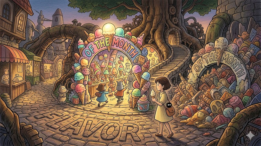 원래 아이스크림 가게에서 이달의 특별 맛을 홍보하는 것에서 유래했습니다. 지금은 "잠깐 주목받다가 빠르게 잊히는 유행·인물·아이디어"를 비판적으로 묘사할 때 씁니다.