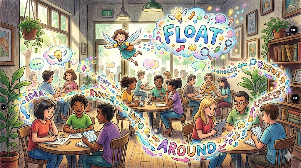float around는 물리적으로 이리저리 떠다니는 것 외에, 소문·아이디어·정보 등이 특정 집단이나 공간 안에서 정처 없이 퍼져 다니는 비유적 의미로 자주 쓰입니다.