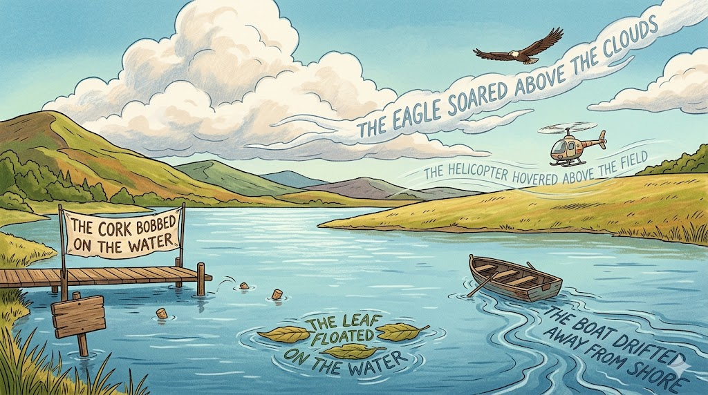 | float | 부유·이동 | 안정적·자연스러운 떠 있음, 다양한 비유 확장 | The leaf floated on the water. |