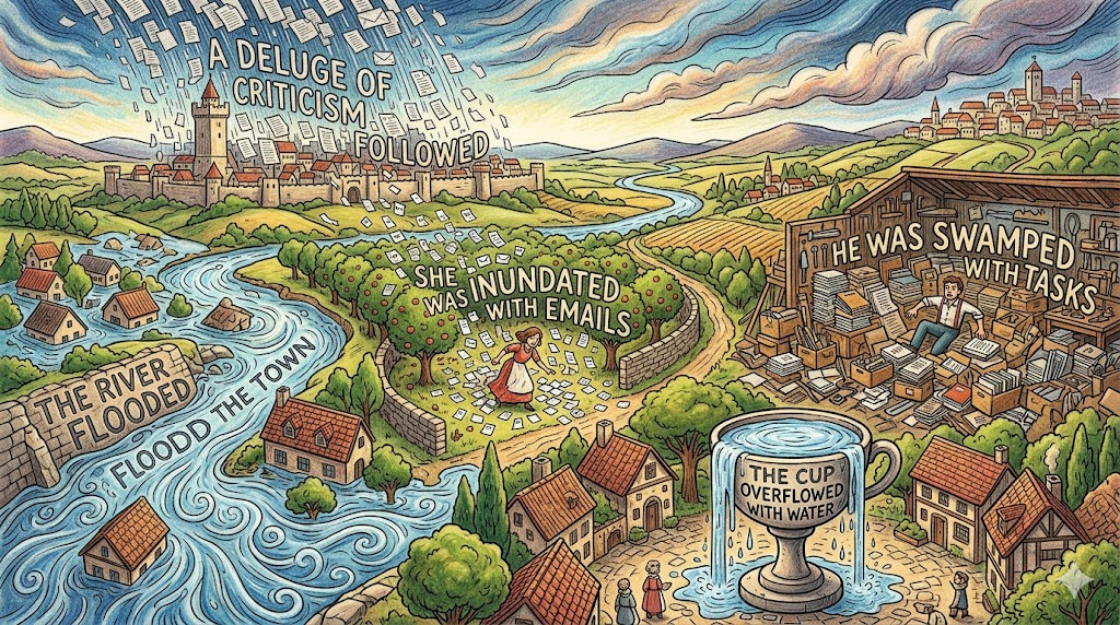 | flood | 넘침·압도 | 광범위하고 통제 불가한 범람, 비유 풍부 | The river flooded the town. |