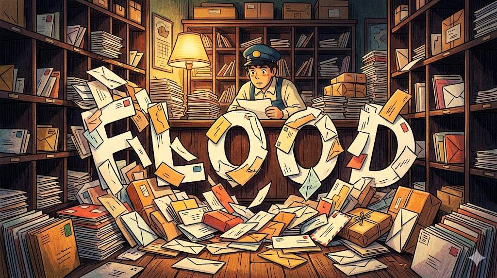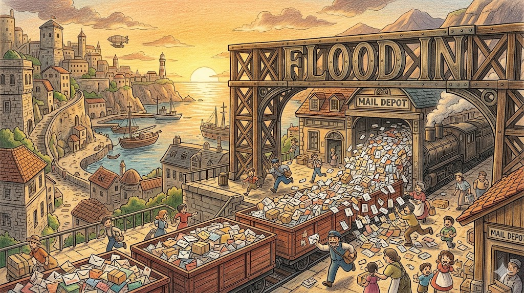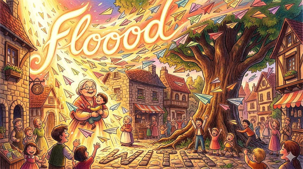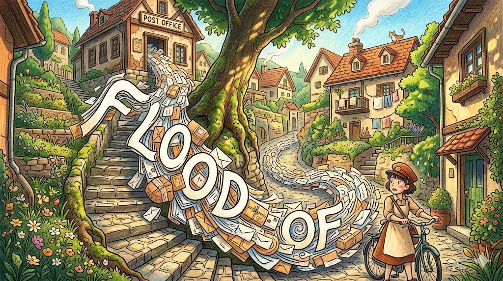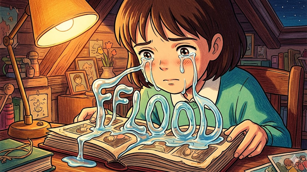 🌟 초등학생 버전 flood는 비가 너무 많이 와서 강물이 넘쳐 마을을 덮치는 "홍수"예요! 그런데 편지나 메시지가 엄청나게 많이 올 때도 "flood"라고 해요. 기억이 갑자기 한꺼번에 밀려올 때도 "a flood of memories"라고 한답니다!