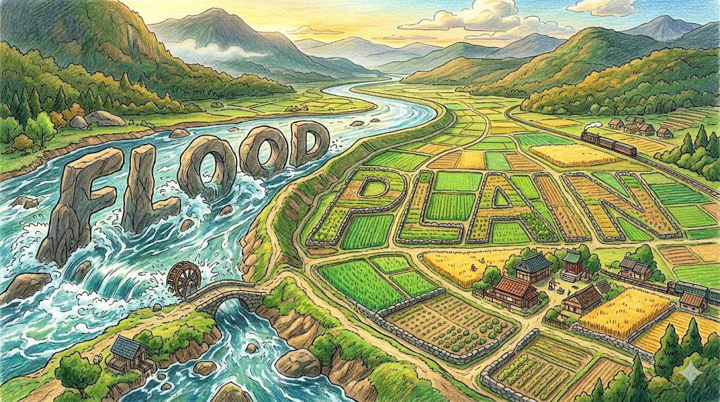 | flood plain | 범람원 | 비옥하나 홍수 위험, 지리 맥락 |