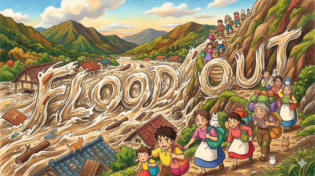 flood out은 홍수·침수로 인해 집이나 장소를 강제로 떠나야 하는 상황을 나타냅니다. 또는 어떤 것이 대량으로 밖으로 흘러나오는 상황에도 쓰입니다.