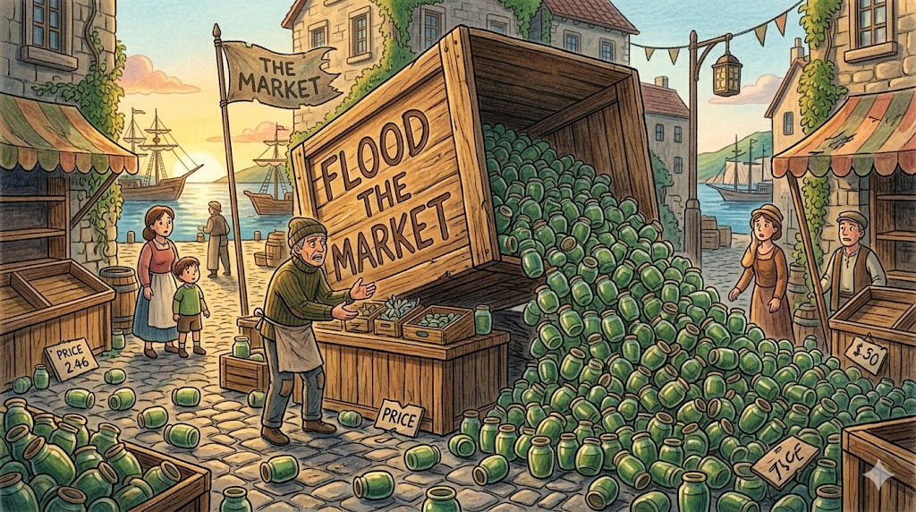 4. flood the market [flʌd ðə ˈmɑːrkɪt]