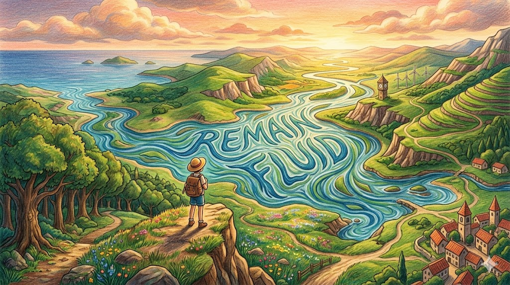 - A fluid identity makes fluid transition possible — because a person who is not rigidly attached to a fixed self-image can move between roles, relationships, and life stages with grace rather than crisis. (유동적 정체성은 부드러운 전환을 가능하게 합니다 — 고정된 자아상에 경직되게 집착하지 않는 사람은 위기가 아닌 우아함으로 역할, 관계, 삶의 단계 사이를 이동할 수 있기 때문입니다.)