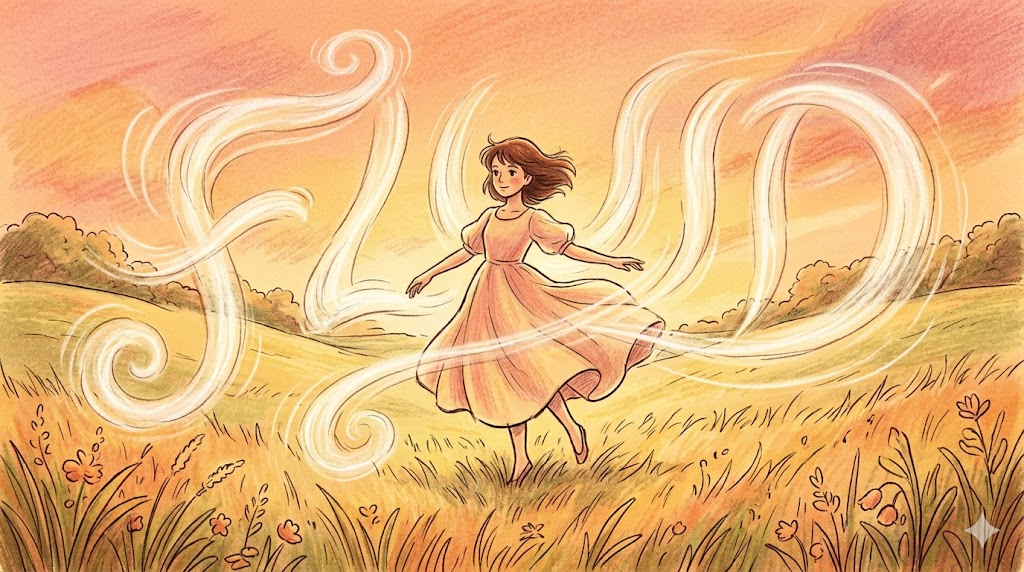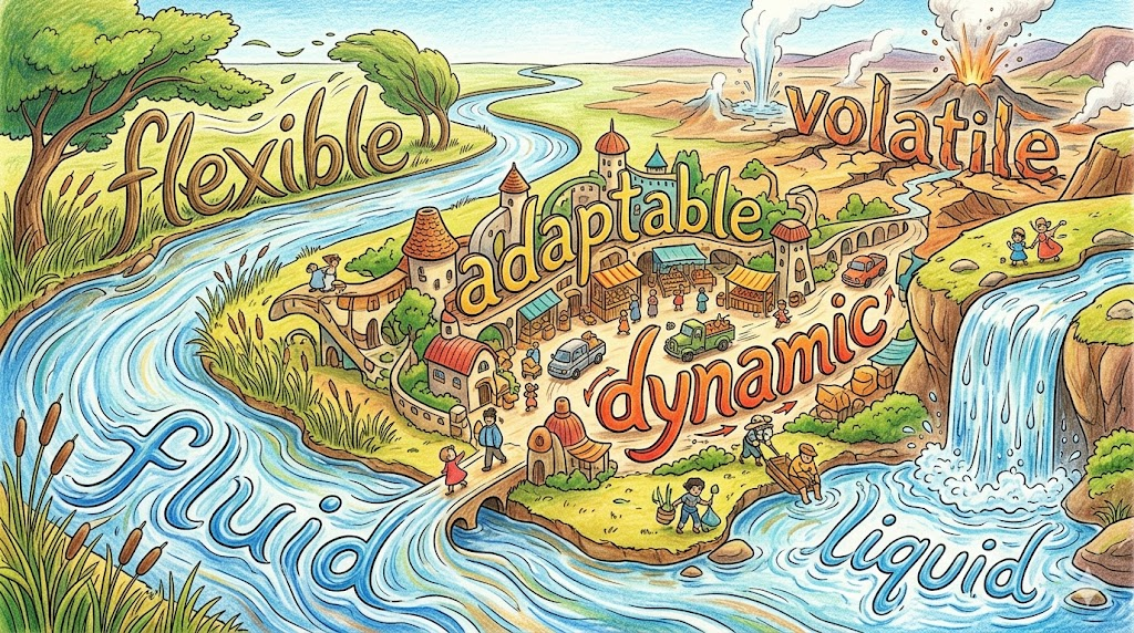 "어떤 형태의 그릇에도 담기고 어떤 장애물도 돌아서 흐르는" 이미지처럼, fluid가 쓰이는 순간 그것은 단순한 액체의 선언이 아니라 "고정된 형태 없이 상황에 따라 자연스럽게 적응하며 흐르는" 유연성의 선언입니다.