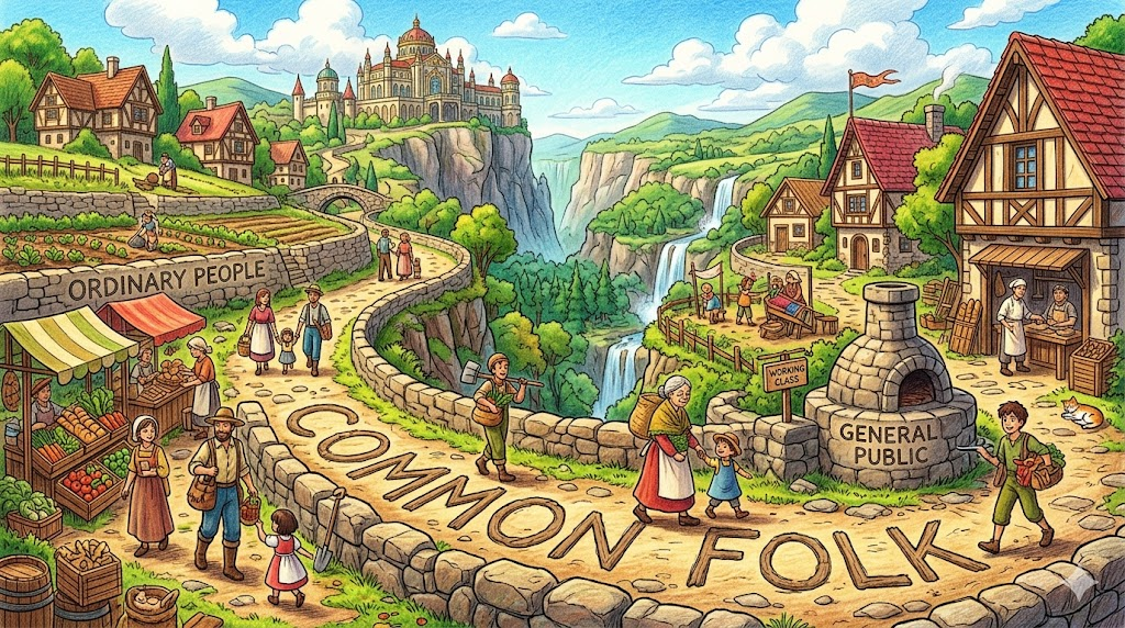 특별한 지위·권력·명성 없이 일상을 살아가는 보통 사람들을 뜻합니다. 겸손함·친근함·소박함의 뉘앙스가 강하며, 때로 "우리는 그냥 평범한 사람들이에요"라는 자기 표현으로도 씁니다.