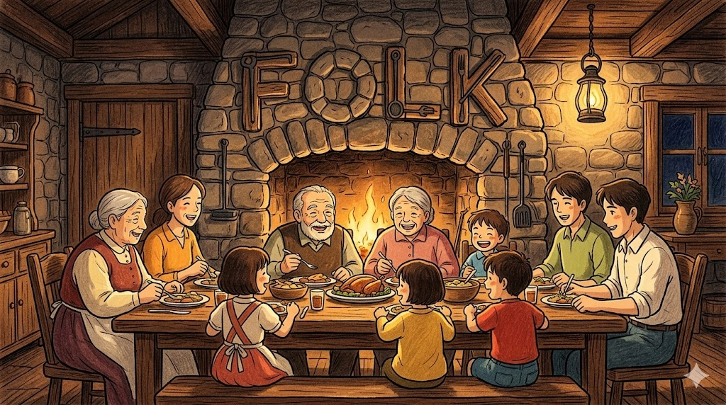"함께 살고 일하며 같은 땅과 문화를 공유하는 평범한 사람들의 공동체" 이미지처럼, folk가 쓰이는 순간 그것은 단순한 사람들의 선언이 아니라 "세대를 넘어 이어지는 삶의 방식과 지혜를 공유하는 집단"의 선언입니다.
