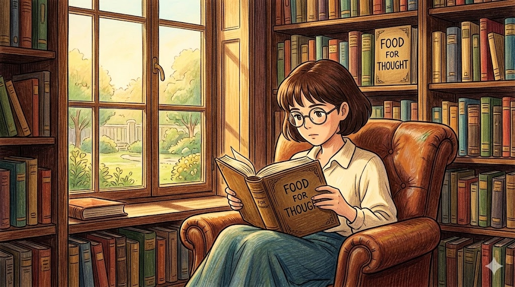 - A great book can be brain food, food for thought, and soul food all at once — feeding the mind, inspiring reflection, and touching something deep in the human spirit. (훌륭한 책은 동시에 뇌에 좋은 음식, 생각할 거리, 그리고 소울 푸드가 될 수 있다 — 마음을 먹여 살리고, 성찰을 자극하며, 인간 정신의 깊은 무언가를 건드린다.)