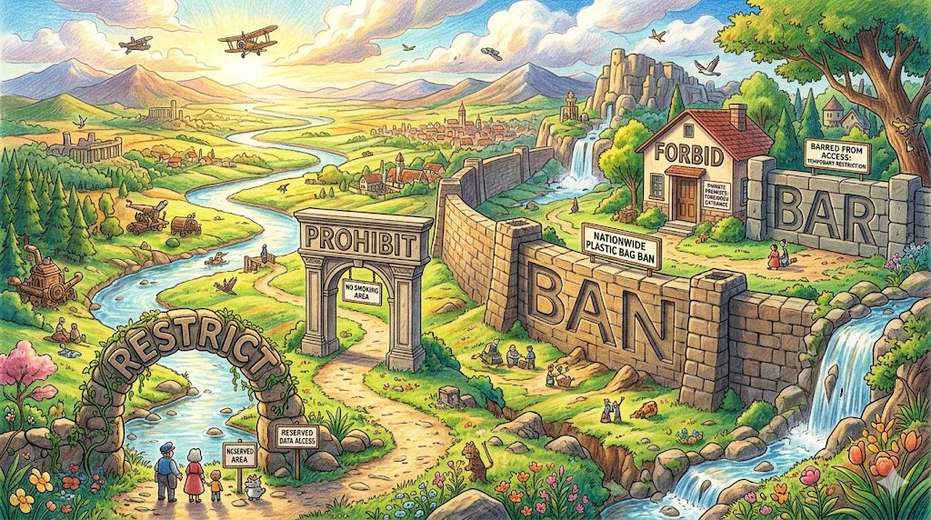 | ban | 전면 금지 | 포괄적·완전한 공식 금지, 강한 금지 강조 | Plastic bags were banned nationwide. |