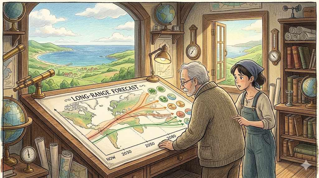 | long-range forecast | 멀리 던진 예측 — 높은 불확실성 | 환경·사회·경제·인구 지문 |