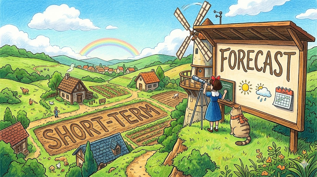며칠에서 몇 달 이내의 가까운 미래를 예측하는 것을 뜻합니다. 데이터가 충분하고 변수가 상대적으로 적어 장기 예측보다 정확하지만, 장기적 추세를 파악하기에는 한계가 있습니다.