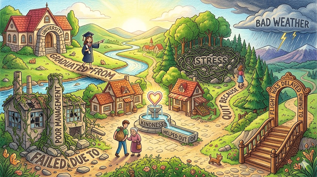 | because of | 원인·이유 | 구어·문어 모두, 원인 일반 | She quit because of stress. |