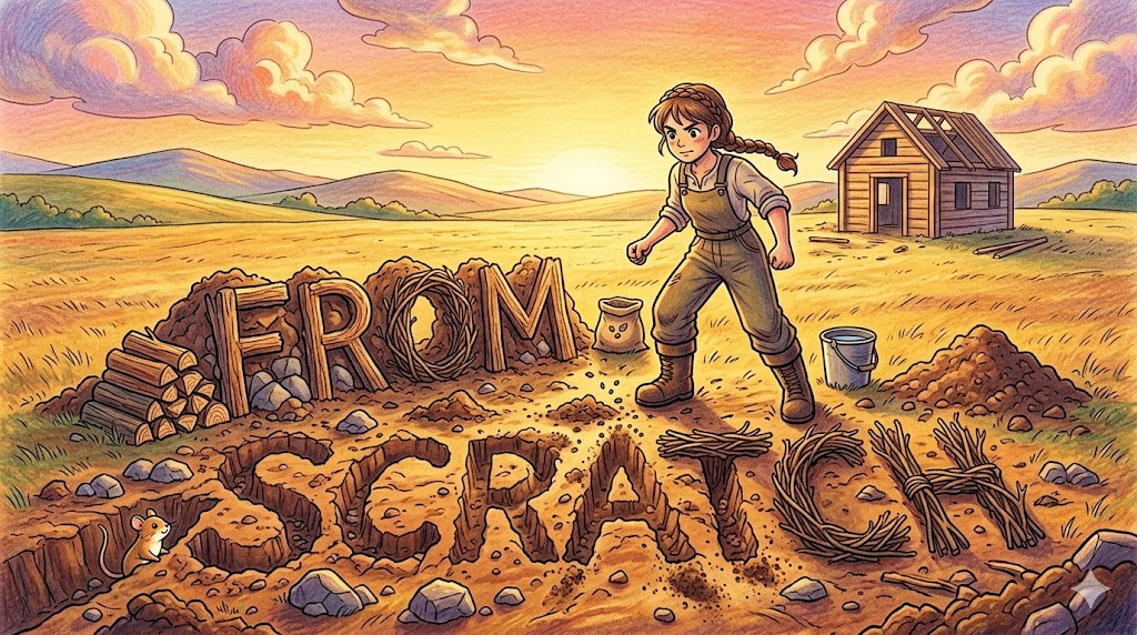 - from scratch → 맨 처음부터·아무것도 없는 상태에서. scratch는 출발선을 바닥에 그어 표시하던 데서 유래. "She built her business from scratch." (그녀는 사업을 맨 처음부터 일으켰어.) — 준비된 것 없이 오직 노력만으로 시작한다는 뉘앙스.