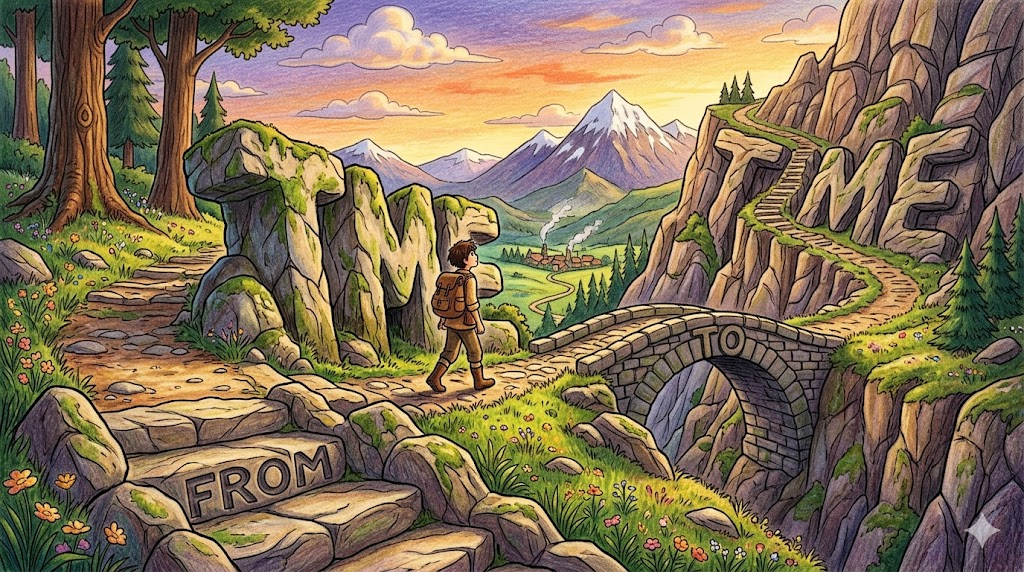 - from → "~에서, ~로부터" — 출발점·기원·원천을 나타내는 가장 기본적인 전치사. 장소, 시간, 사람, 원인 모두에 쓰임. "I'm from Korea." (저는 한국 출신이에요.) — 가장 간단하지만 쓰임이 가장 넓은 전치사 중 하나.