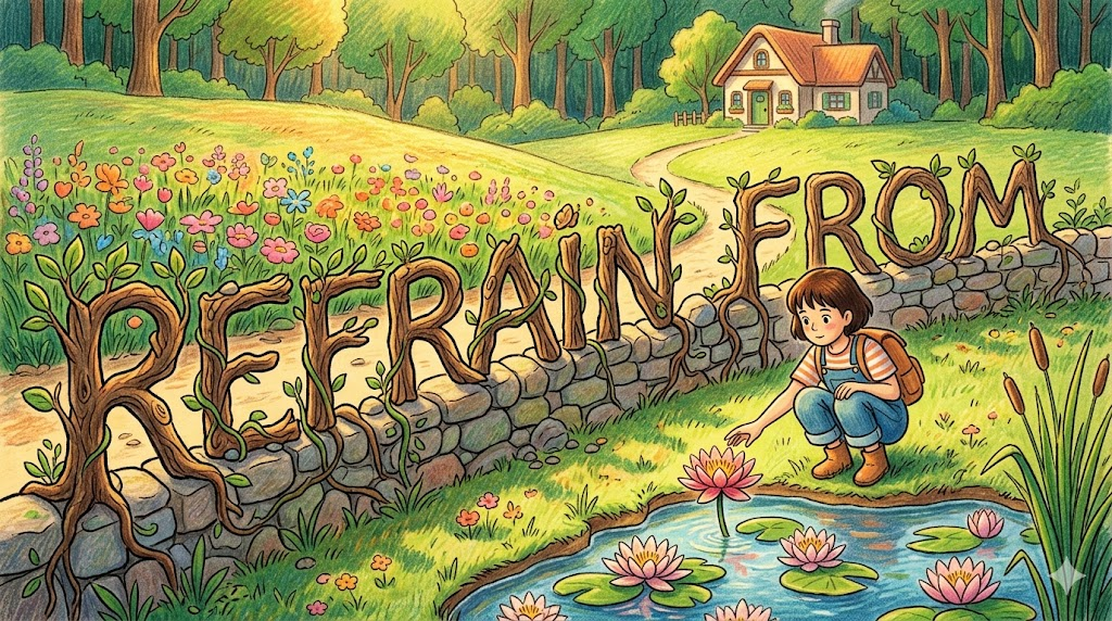 - refrain from → ~을 자제하다·~을 삼가다. 하고 싶은 것을 의식적으로 참는 것. "Please refrain from using your phone during the meeting." (회의 중 휴대폰 사용을 삼가주세요.) — 공식적인 요청이나 규칙에서 자주 등장.