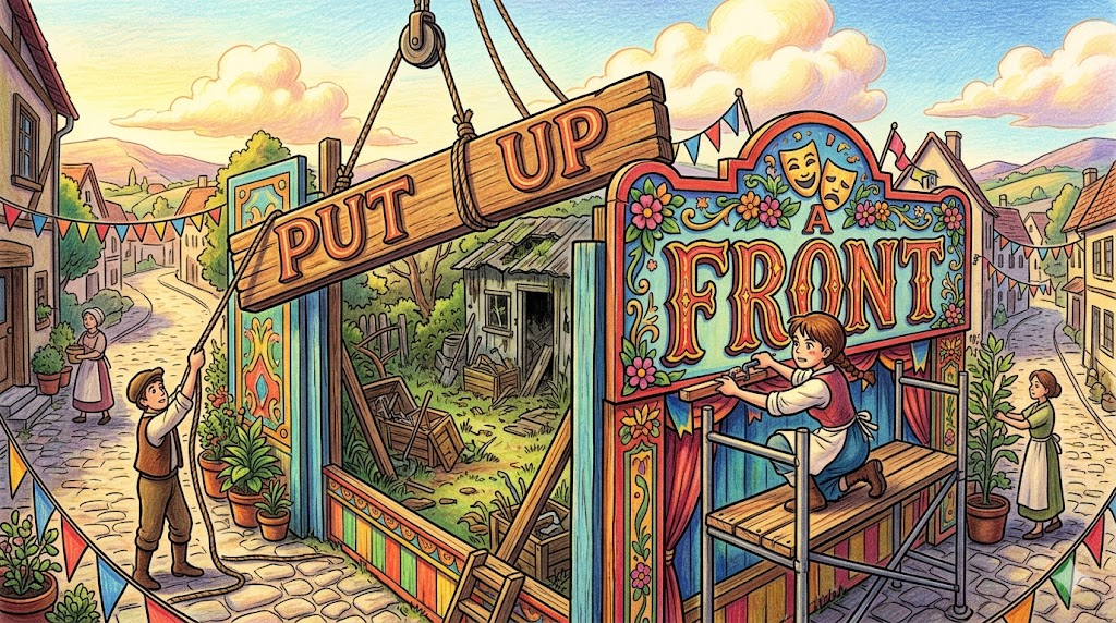 - put up a front → 겉으로만 꾸미다·가면을 쓰다. 실제 감정이나 상태를 숨기고 다른 모습을 보여주는 것. "She put up a brave front even though she was terrified inside." (그녀는 속으로는 겁에 질렸지만 겉으로는 용감한 척했어.) — 허세·위장의 뉘앙스.
