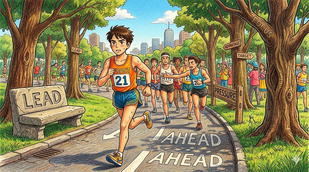 경주·경쟁·선거에서 현재 앞서가는 사람이나 조직을 뜻합니다. 선두에 있다는 이점과 동시에 모든 경쟁자의 표적이 된다는 부담을 함께 수반하는 뉘앙스가 강합니다.