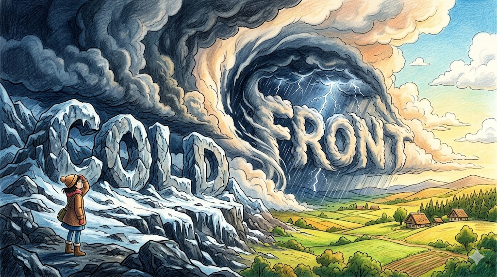 차가운 공기 덩어리가 따뜻한 공기 덩어리와 만나는 경계를 뜻합니다. 기상학에서는 급격한 기온 하강·강수·폭풍을 동반하며, 비유적으로 갑작스럽고 차가운 태도 변화를 묘사할 때도 씁니다.