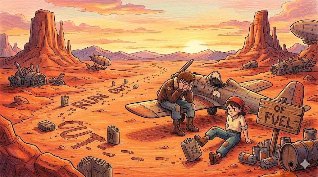 - run out of fuel → 연료가 떨어지다·바닥나다. 에너지가 완전히 소진된 상태. "The plane ran out of fuel mid-flight." (비행기가 비행 중 연료가 떨어졌어.) — 물리적 연료뿐 아니라 기력·의욕이 고갈된 상태에도 비유.