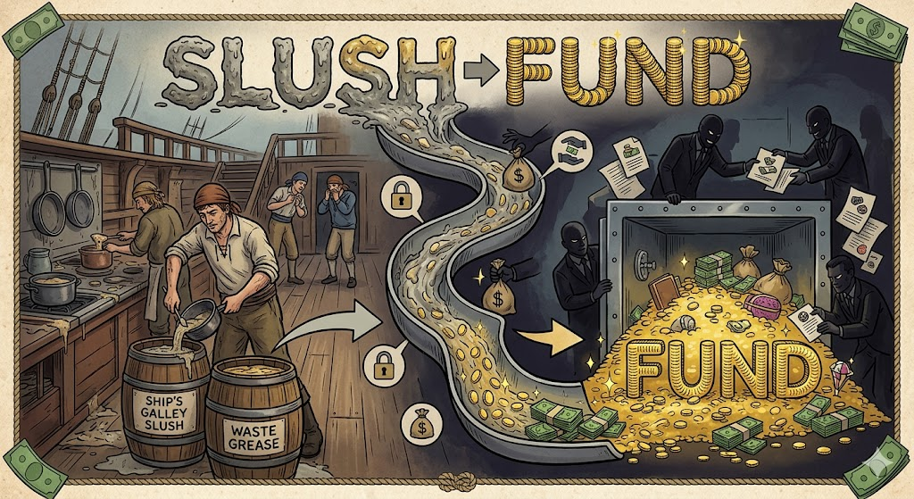 slush fund는 불법적이거나 비공식적인 목적을 위해 비밀리에 축적한 자금을 나타냅니다. 원래 선원들이 배에서 나온 슬러지(찌꺼기)를 팔아 만든 비공식 자금에서 유래했으며, 부패·정치 비리 지문에서 등장합니다.