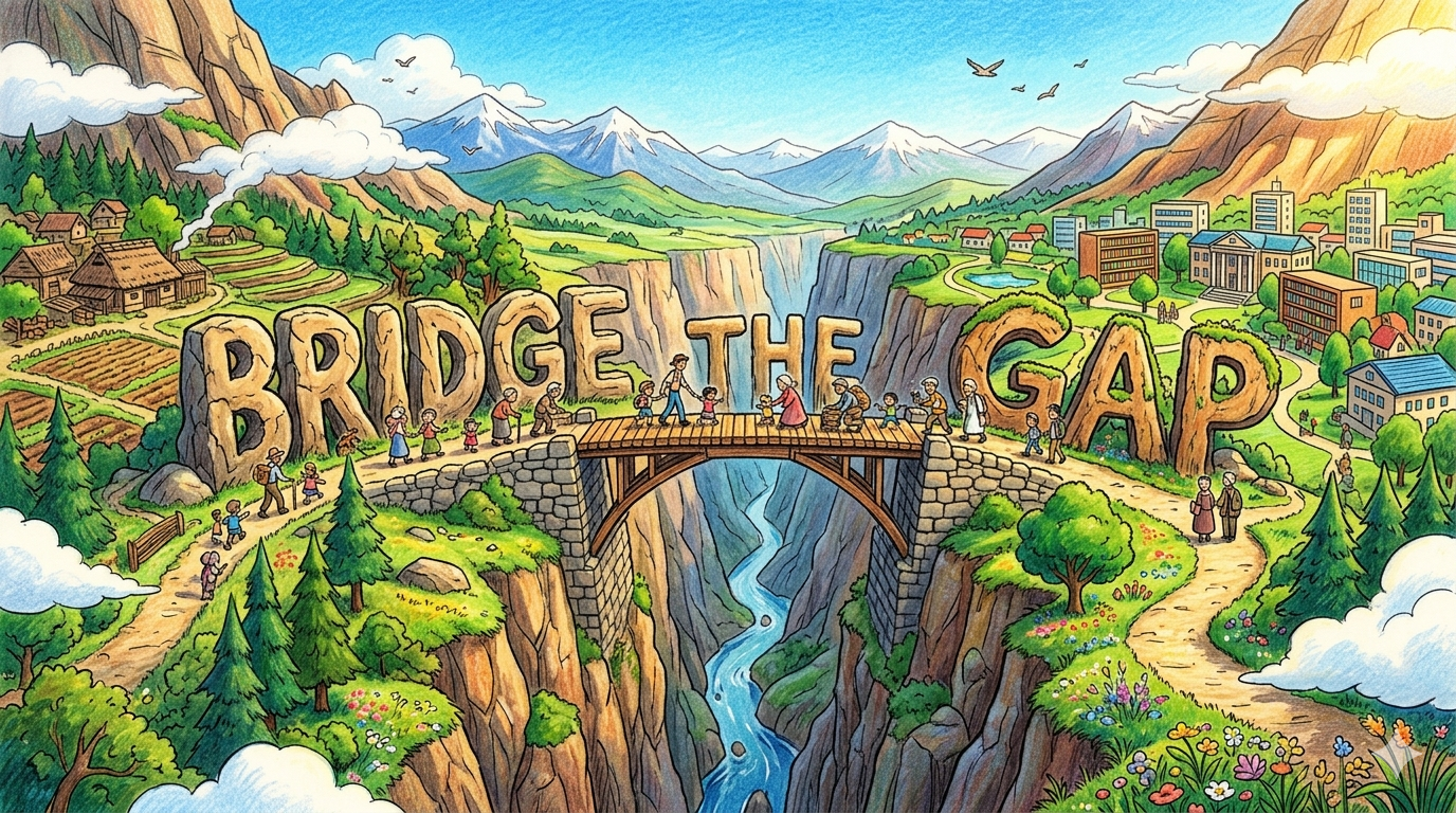 두 대상 사이의 차이·거리·불평등을 줄이거나 연결하는 것을 강조합니다. 다리(bridge)가 두 지점을 연결하듯 간극을 메우는 행위의 이미지가 핵심입니다.