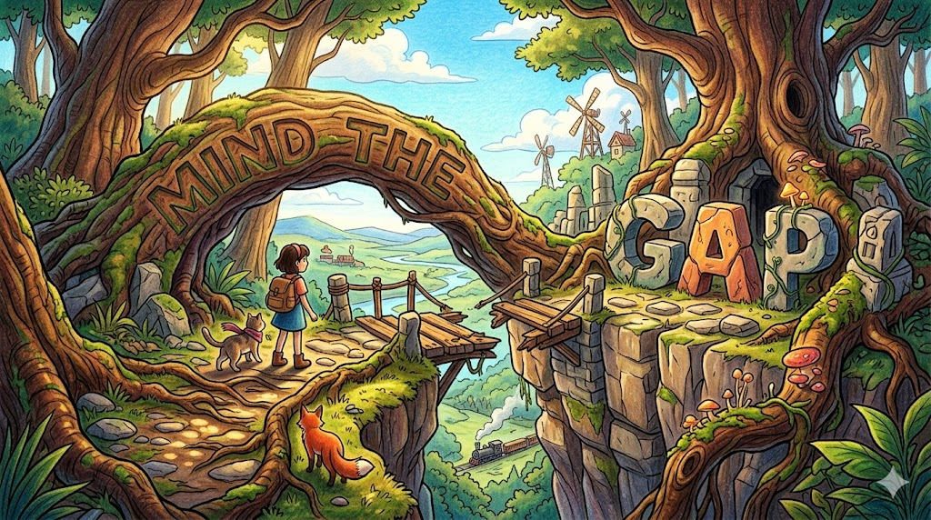 "gap은 '틈, 간격'이야. 울타리의 구멍처럼 물리적인 틈도 gap이고, 세대 간의 차이, 남녀 간의 격차도 다 gap이야. bridge the gap은 '격차를 좁히다'인데, 다리로 틈을 잇는 이미지야 — 빈부 격차를 줄이거나 서로 다른 두 집단을 연결할 때 써. gap year는 학교 졸업 후 바로 진학하지 않고 여행이나 봉사로 보내는 1년이야. mind the gap은 런던 지하철 안내 방송이야 — '틈을 조심하세요'라는 뜻인데, 비유적으로도 많이 써. generation gap은 세대 차이, gender gap은 성별 격차야. gap in the market은 아직 아무도 채우지 않은 사업 기회야!"