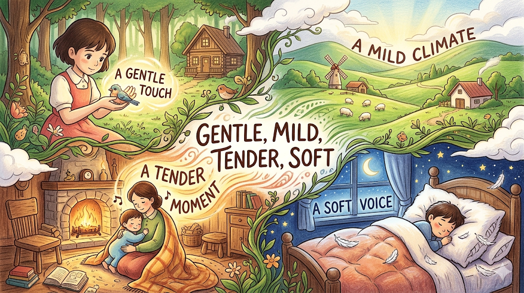 - gentle → "부드러운, 온화한, 순한" — 힘이나 강도가 세지 않고 조심스럽고 부드러운 것. 사람의 성품부터 바람, 경사까지 모두 씀. "She spoke in a gentle voice." (그녀는 부드러운 목소리로 말했어.)