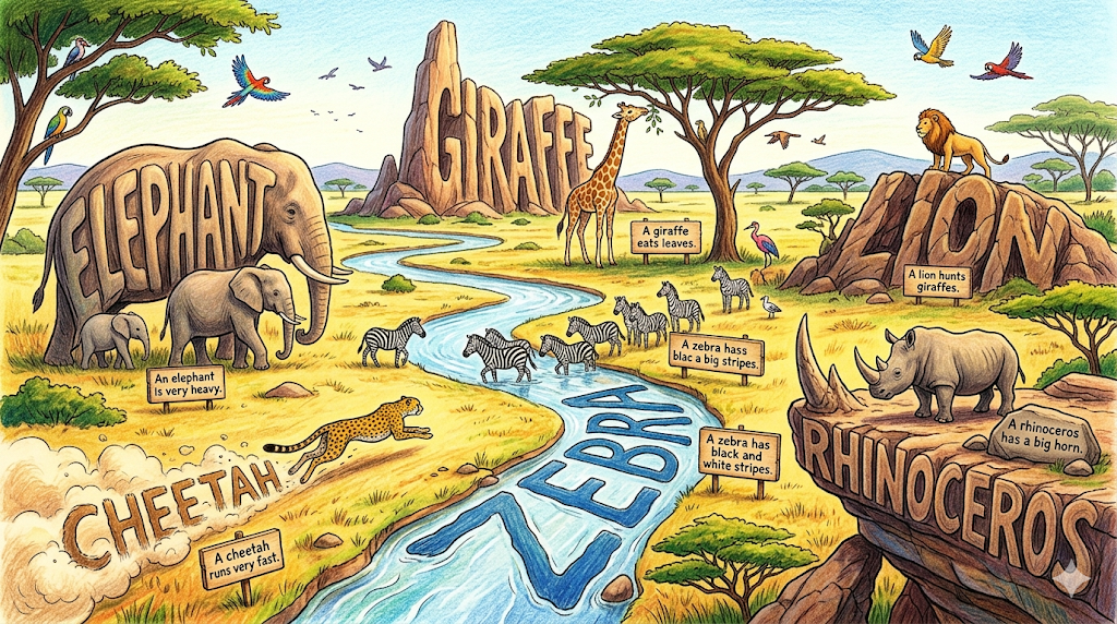 - giraffe → "기린" — 지구상에서 가장 키가 큰 육상 동물. 아프리카 사바나에 서식하며 긴 목으로 나무 꼭대기의 잎을 먹음. "Giraffes can grow up to 6 meters tall." (기린은 최대 6미터까지 자랄 수 있어.)