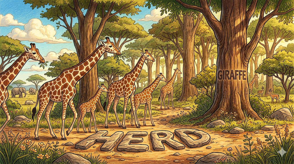 - giraffe herd → 기린 무리. 기린은 무리를 지어 생활하는데, 기린 무리는 특별히 'tower'라고도 부름. "We spotted a giraffe herd grazing near the river." (우리는 강 근처에서 풀을 뜯는 기린 무리를 발견했어.)