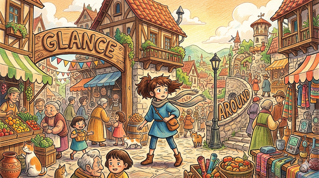 "glance는 '힐끗 본다'는 뜻이야. 선생님 눈치를 보며 옆 친구를 재빨리 슬쩍 보는 게 바로 glance야. gaze처럼 오래 바라보는 게 아니라 순간적으로 한 번 훑는 거야. steal a glance는 들키지 않으려고 몰래 훔쳐보는 것 — 좋아하는 친구를 몰래 보는 느낌이야. exchanged glances는 두 사람이 눈빛으로 '너도 그렇게 생각하지?'라고 신호를 주고받는 거야. at first glance는 '처음 봤을 때는' — 자세히 보면 다를 수 있다는 뉘앙스야!"