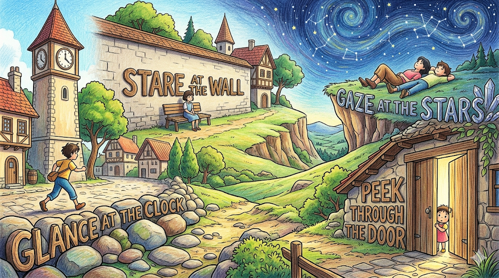 - glance → "힐끗 보다, 재빨리 훑어보다" — 오래 집중하지 않고 짧게 한 번 보는 것. look이나 gaze보다 훨씬 빠르고 가볍다. "She glanced at her watch." (그녀는 시계를 힐끗 봤어.)