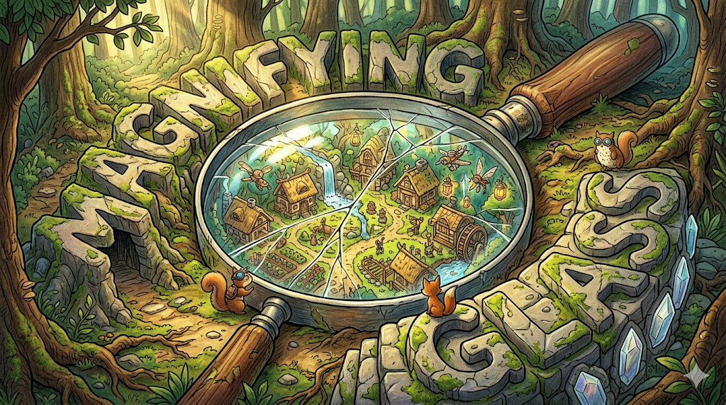 물체를 크게 보여주는 볼록 렌즈 도구를 가리킵니다. 비유적으로 무언가를 더 자세히 살펴보는 행위를 표현하기도 합니다.