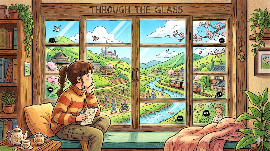 (일상/문학/수능) "유리를 통해"를 뜻합니다. 유리 너머로 보이는 것을 묘사하거나, 비유적으로 간접적으로 무언가를 경험하는 것을 나타냅니다.