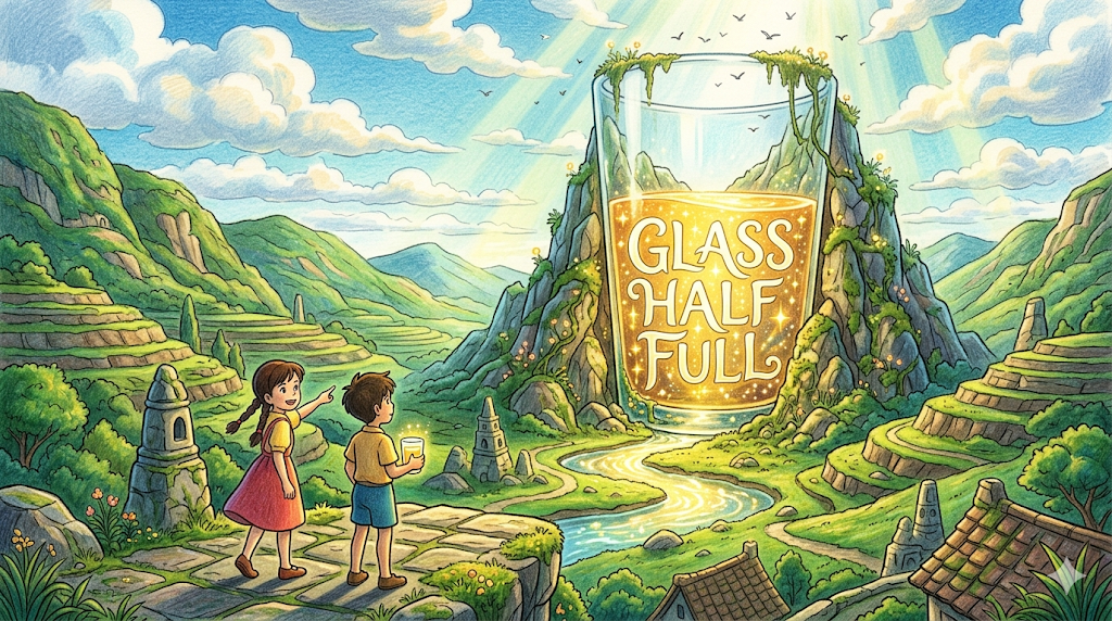 | glass half full | 긍정적인 태도 | 같은 상황을 희망적으로 바라보는 관점 | 심리·철학 |