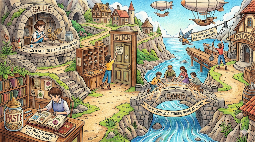 | stick | 접착·붙임 | 접착 행위, 다양한 방법 포함 | He stuck the note on the door. |