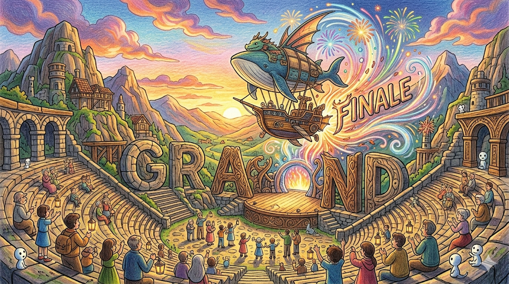 - The last song of the concert was the grand finale — everyone stood up and clapped. (콘서트의 마지막 노래가 대단원이었습니다 — 모든 사람이 일어서서 박수를 쳤습니다.)